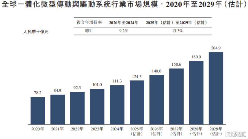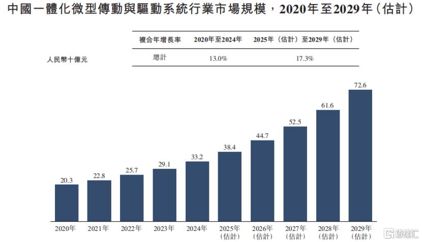 按照弗若斯特沙利文演讲,中国一体化微型传动取驱动系统市场规模已由2020年的203亿元增加至2024年的332亿元,年均复合增加率达13。0%。估计正在财产升级取手艺前进鞭策下,该市场将于2029年达到726亿元,2025年至2029年的年均复合增加率将进一步提拔至17。3%。