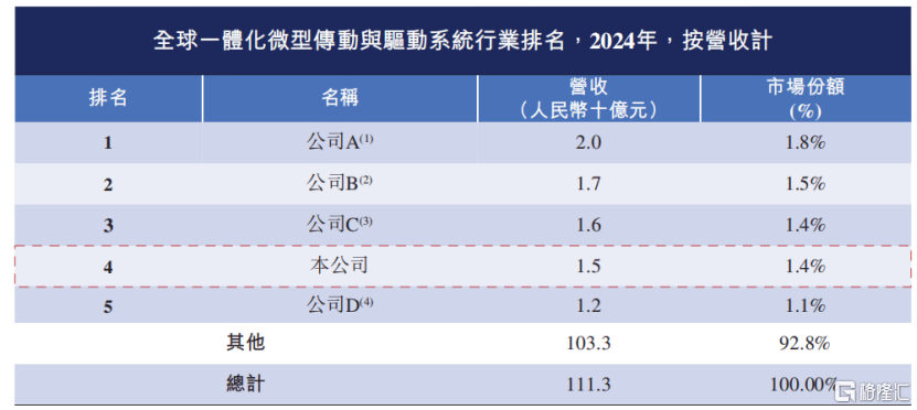 按照弗若斯特沙利文演讲,全球及中国一体化微型传动取驱动系统市场高度分离,别离有跨越500家及200家参取者正在分歧的细分市场和地域运营。按2024年收入计,兆威机电是中国最大的一体化微型传动取驱动系统产物供给商,是全球第四大一体化微型传动取驱动系统产物供给商,市场份额别离为3。9%及1。4%。公司正在全球范畴内的次要合作敌手包罗汉臣、日本电产、江苏雷利、鸣志电器、鼎智科技、伟创电气等。