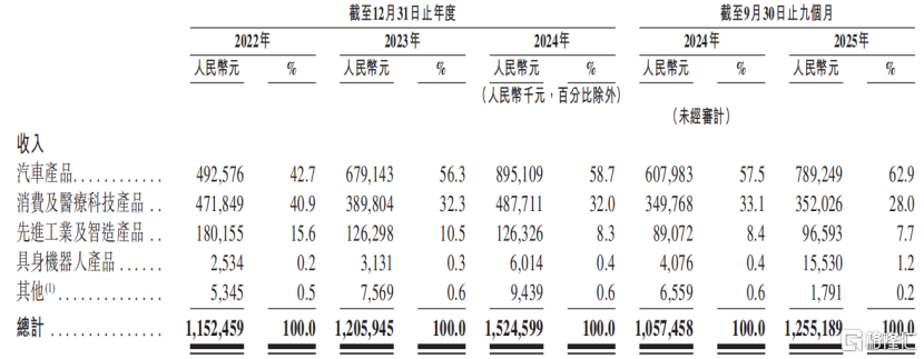 2022年至2024年,公司来自汽车产物的收入由4。93亿元增加至8。95亿元,占比由42。7%增加至58。7%。然而,公司来自消费及医疗科技产物的收入占比则有所下降。2022年至2023年,消费及医疗科技产物的收入由4。72亿元削减至3。9亿元,次要因为2023年消费科技范畴客户的需求降低。