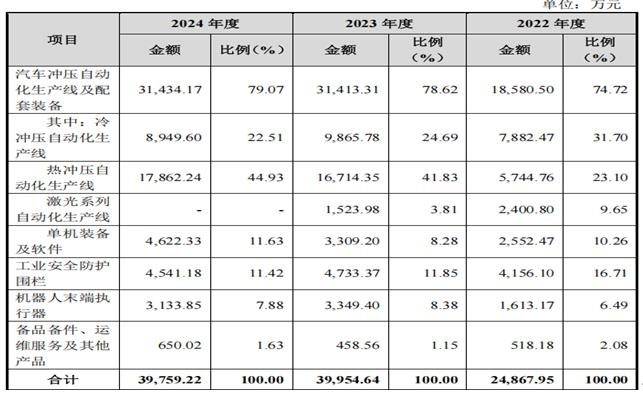 演讲期内,奥图股份从停业务收入次要来自于汽车冲压从动化出产线及配套配备、工业平安防护围栏和机械人结尾施行器等产物,此中汽车冲压从动化出产线及配套配备是公司的次要收入来历,2022年-2024年收入占比别离为74。72%、78。62%和79。07%,逐期提拔。