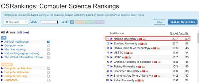 2026年CSRankings显示,南京大学以23。7分高居人工智能范畴全球第一,成为首所登顶该细分榜单的中国高校。更令人振奋的是,AI范畴全球前10名全数由中国高校包办。