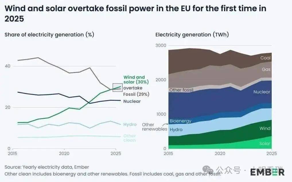 Ember发布的数据显示,2025年欧盟风能和太阳能发电量占欧盟总发电量的30%,初次跨越化石能源的29%,这是继2024年欧盟太阳能发电量初次跨越煤炭之后的又一汗青性冲破。